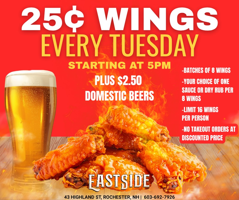 Come to Eastside every Tuesday night starting at 5PM to get 25¢ wings and $2.50 domestic beers!