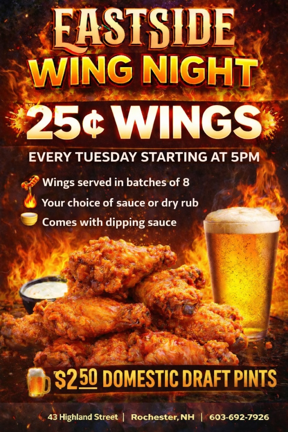 Come to Eastside every Tuesday night starting at 5PM and get 25¢ wings and $2.50 domestic beers!
